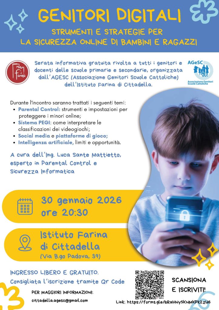 Il tema dell’incontro sarà: “GENITORI DIGITALI: Strumenti e strategie per la sicurezza online di bambini e ragazzi” a cura dell’Ing. Luca Sante Mattietto, esperto in Parental Control e sicurezza informatica.